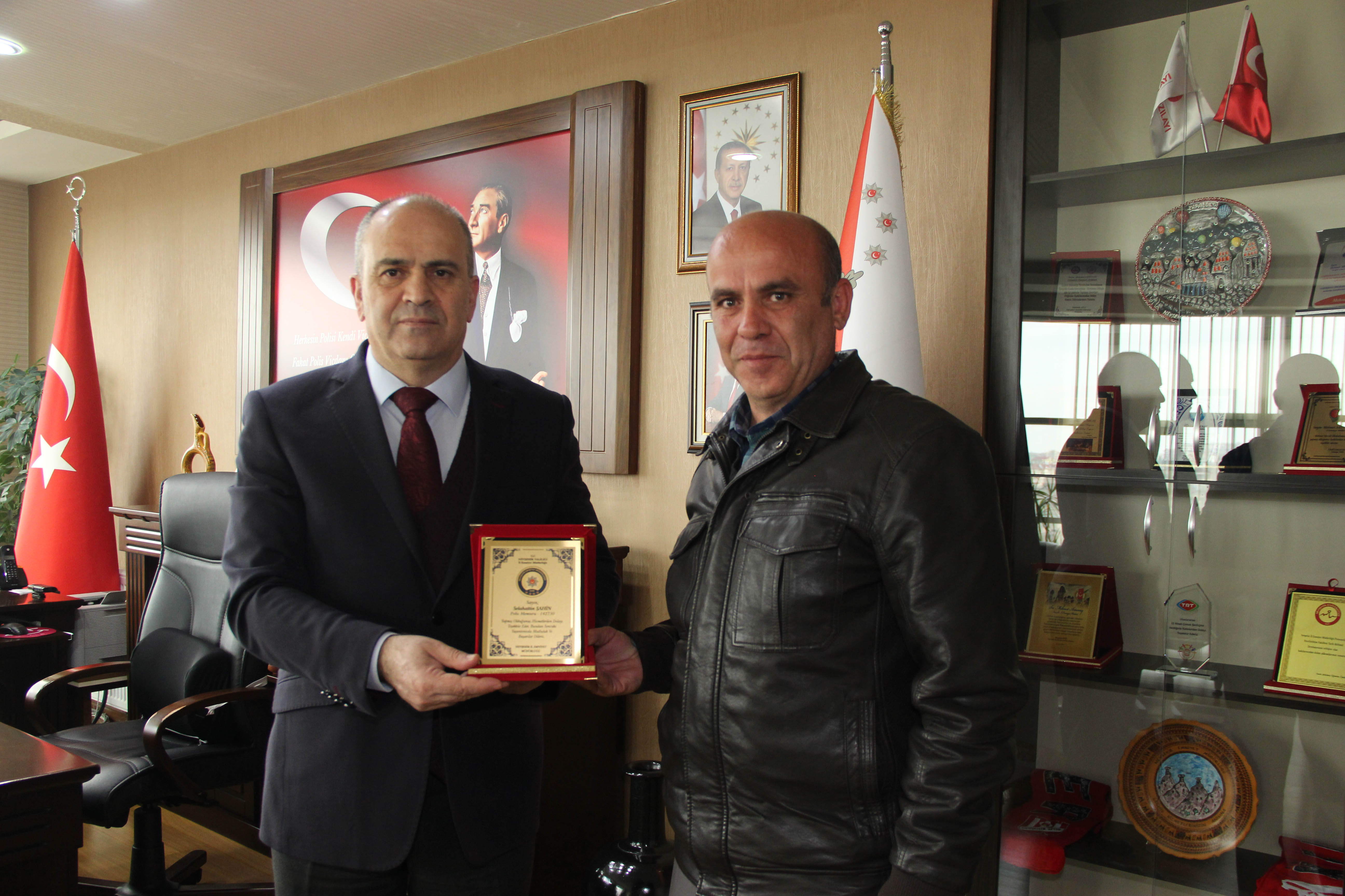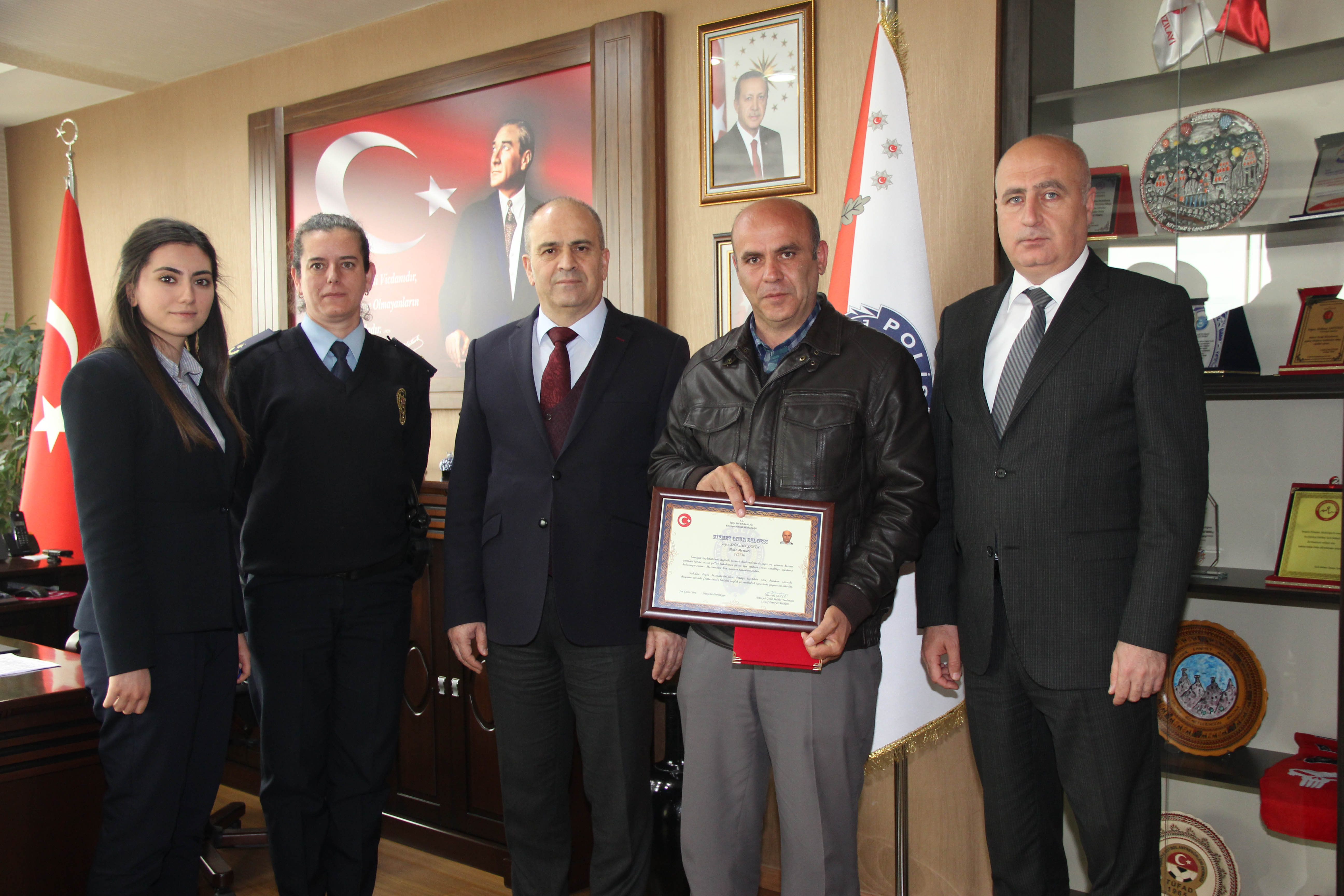 Derinkuyu İlçe Emniyet Amirliği kadrosunda görevli Polis Memuru Selahattin Şahin ‘i Nevşehir Emniyet Müdürü Mehmet Artunay makamında kabul ederek ‘Hizmet Onur Belgesi’ verdi.