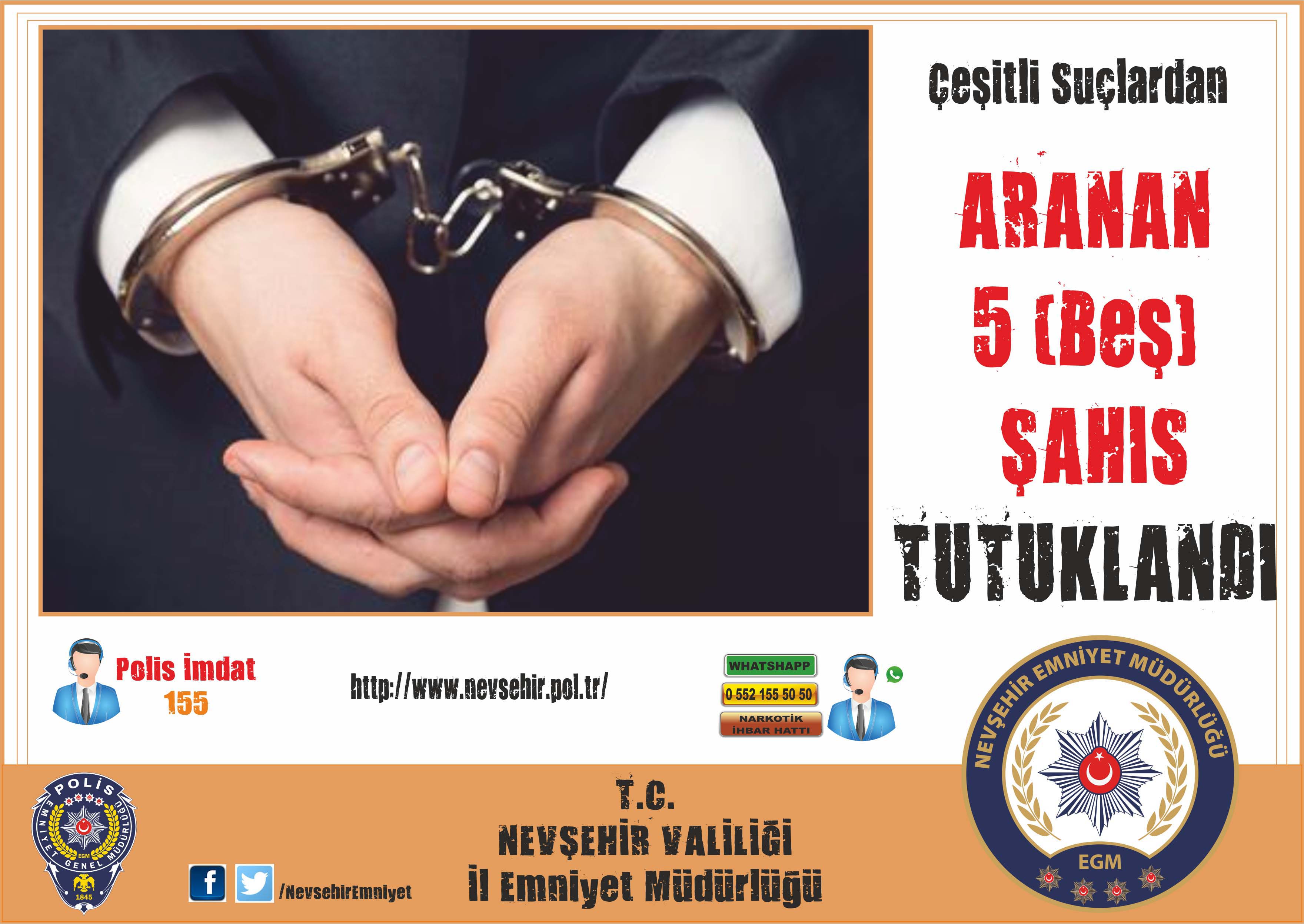 Müdürlüğü Asayiş Şube Müdürlüğü çeşitli suçlardan aranan kişiler yakalanmasına yönelik yapmış olduğu çalışmalarda; Fuhuş suçundan 1 yıl 8 ay hapis cezası ile aranan F.T. Tehdit suçundan 10 ay hapis cezası ile aranan E.Ö. Kasten Yaralama suçundan 150 gün hapis cezası ile aranan D.K. Trafik Güvenliğini Kasten Tehlikeye Sokmak  suçundan 25 gün hapis cezası ile aranan M.S. ve Kasten Yaralama suçundan 6 Ay hapis cezası ile aranan Ö.T. Toplam 5 kişinin yapılan çalışma sonucunda yakalandı,  Adli mercilerce Tutuklanarak Nevşehir EA Tipi ceza evine gönderildi