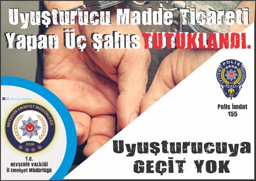 AVANOS İlçe Emniyet Müdürlüğü ve Narkotik Suçlarla Mücadele Şube Müdürlüğü ekiplerinin ortaklaşa yapmış oldukları çalışmalar neticesinde, uyuşturucu madde ticareti yapan şahıslara yönelik uzun süredir haklarında çalışma yapılan H.O., V.Y. ve A.T. isimin deki kişiler yakalandı.Şahısların çıkarılmış oldukları mahkemece ‘Uyuşturucu Madde Ticareti Yapmak’ suçundan tutuklanarak Nevşehir kapalı cezaevine gönderildi.