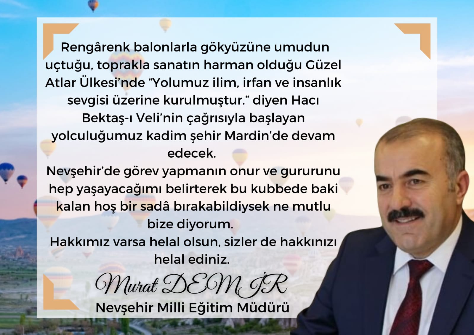 NEVŞEHİR(TRENDHABER)- Mardin Milli Eğitim Müdürlüğü görevine atanan Nevşehir Milli Eğitim Müdürü Murat Demir, bir veda mesajı yayımladı. Demir mesajında şu düşünceleri aktardı; “ Tarih ve turizmin muh...