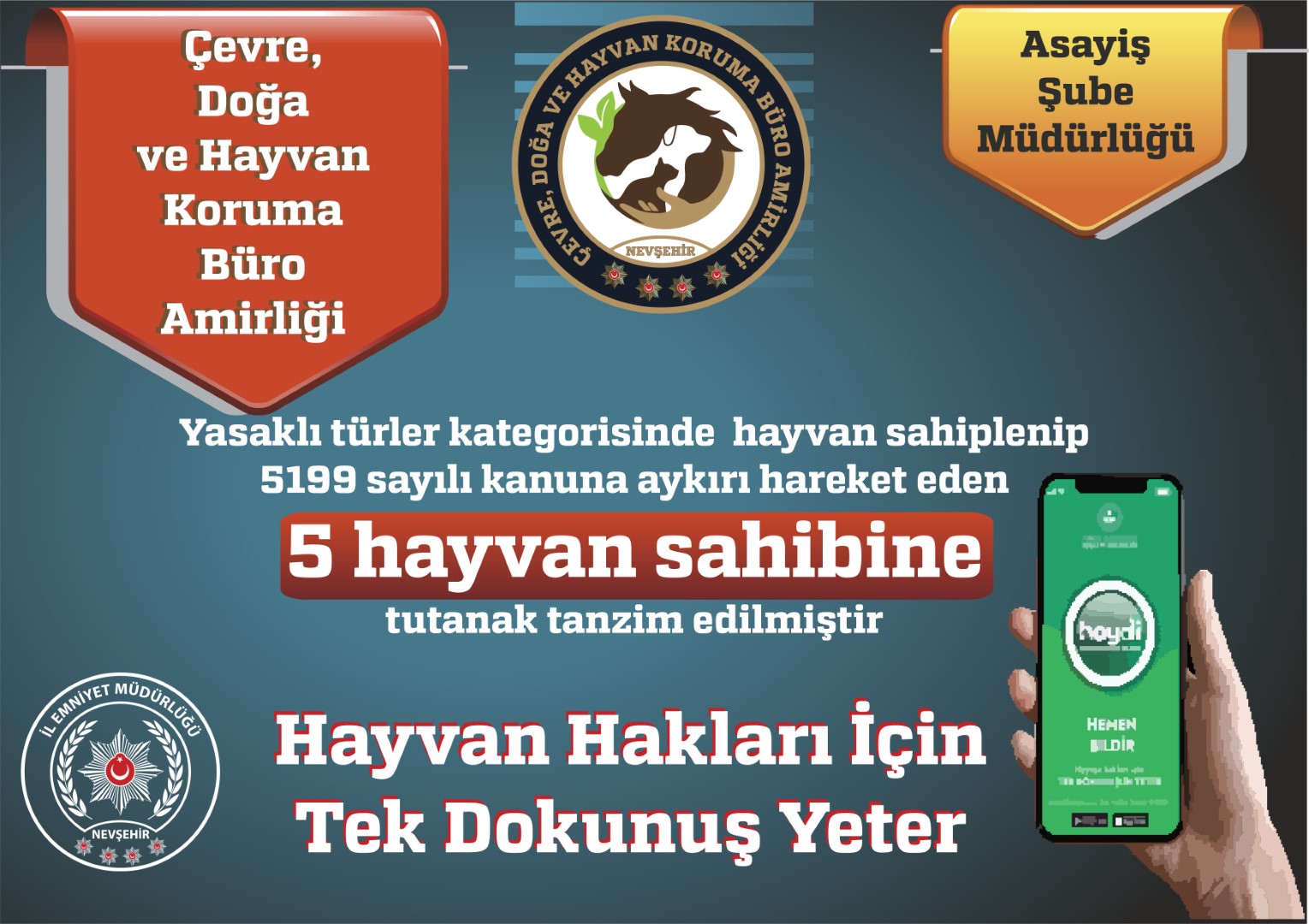 NEVŞEHİR(TRENDHABER)- Nevşehir Emniyet Müdürlüğü ekiplerince, yasaklı türler kategorisinde hayvan sahiplendikleri belirlenen 5 kişi hakkında tutanak tanzim edildi. Alınan bilgilere göre, Nevşehir Emni...