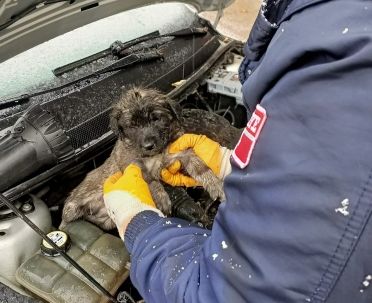 ISINMAK İÇİN GİRDİĞİ OTOMOBİL MOTORUNDA SIKIŞAN KÖPEK KURTARILDI