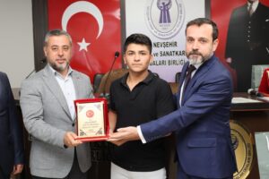 NEVESOB Başkanı Mehmet Pınarbaşı’nın Nevşehir Valisi Ali Fidan’a kaftan takdimi akabinde 2023 yılı İlin Ahisi 40 yıllık esnaf ve sanatkar İhsan Tükel, İlin Kalfası Adnan Başkay ve İlin Çırağı Zülfikar Kağan Koz’a plaket ve ödülleri protokol tarafından takdim edildi.