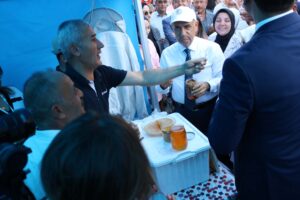 Eşi Hanife Kirişçi ile birlikte Ürgüp ilçesinin köylerinde yetiştirilen tarım ürünleri hakkında kurulan köy standlarında üreticilerle sohbetler de yapan Bakan Kirişçi, Boyalı köyü standında yer alan bal üreticisi Mehmet Kömürcü’nün ürettiği bal ile ilgili olarak kısa da bir sohbet yaptı. Bal üreticisi Mehmet Kömürcü, bölgenin en doğal ürününü yetiştirmenin yıllardan beri haklı gururunu tüm bölge insanları ile birlikte yaşadığını belirterek, yetiştirdiği baldan Bakan Kirişçi’ye ikram etti.