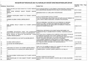 NEVŞEHİR(TRENDHABER)- 213 Sayılı Vergi Usul Kanununun 5 inci maddesi ve 561 Sıra No.lu Vergi Usul Kanunu Genel Tebliği uyarınca; 2024 vergilendirme dönemine ilişkin Yıllık Gelir Vergisi, Gayrimenkul Sermaye İradına ilişkin Gelir Vergisi ve Kurumlar Vergisi beyannamelerinin değerlendirilmesi sonucunda Nevşehir İlinde en fazla vergi beyan eden 50 mükellef açıklandı.