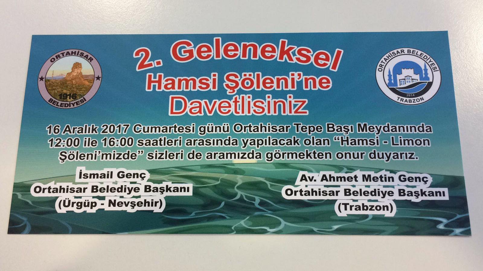 Trabzon Ortahisar Belediyesi ile Nevşehir’in Ürgüp ilçesine bağlı Ortahisar Belediyesinin düzenlediği 2. Hamsi Festivali 16 Aralık Cumartesi günü Ortahisar Tepebaşı meydanında düzenlenecek.