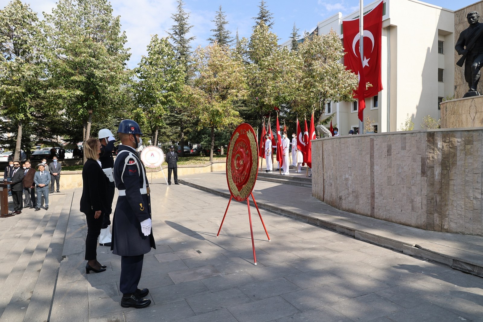 Törende Atatürk Anıtı’na; Vali İnci Sezer Becel Valilik Çelenk’ini ve akabinde Belediye Başkanı Dr. Mehmet Savran Belediye Çelenk’ini sundular.