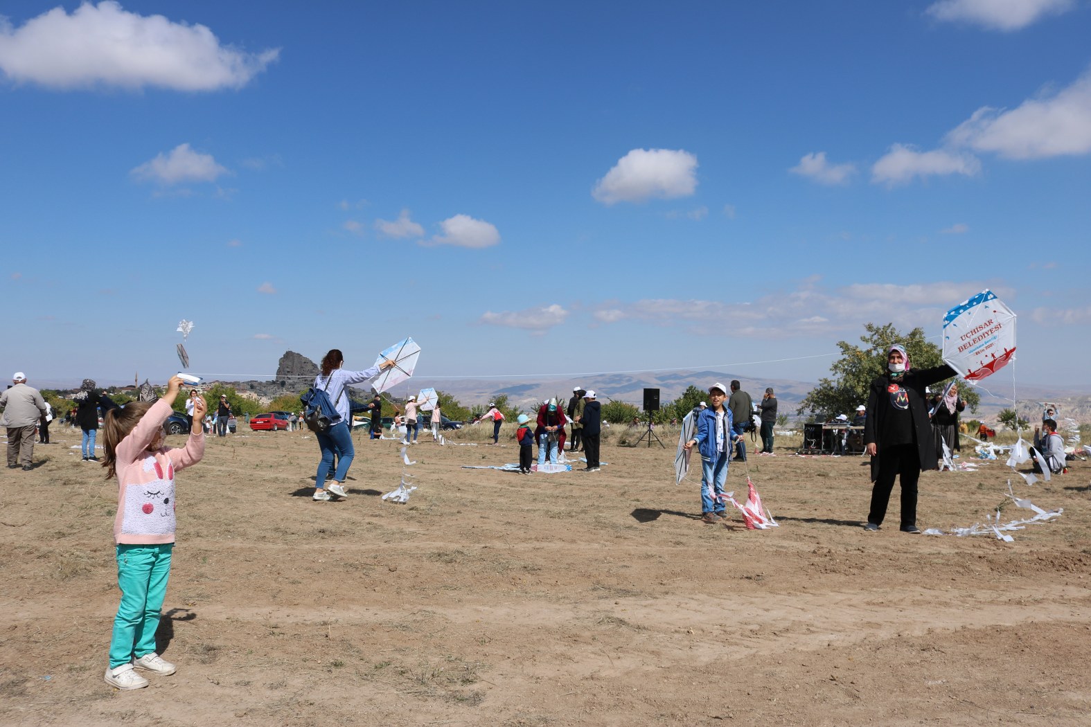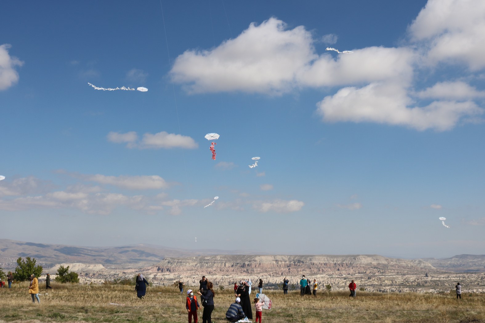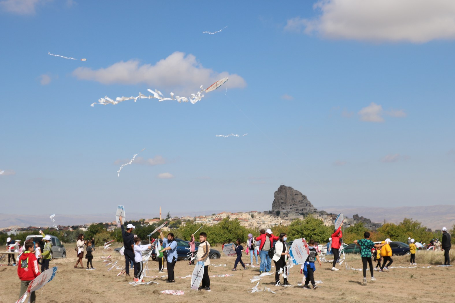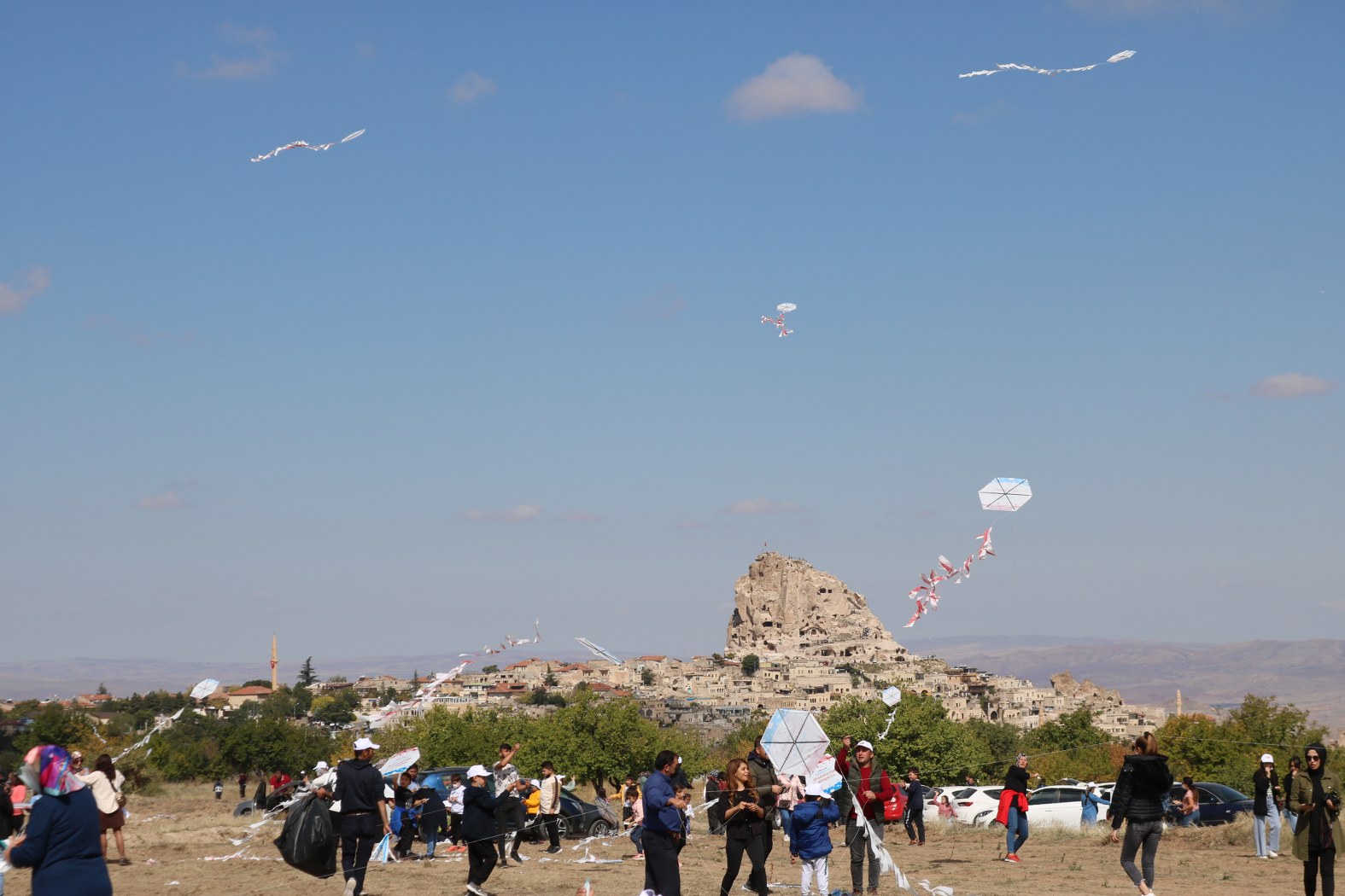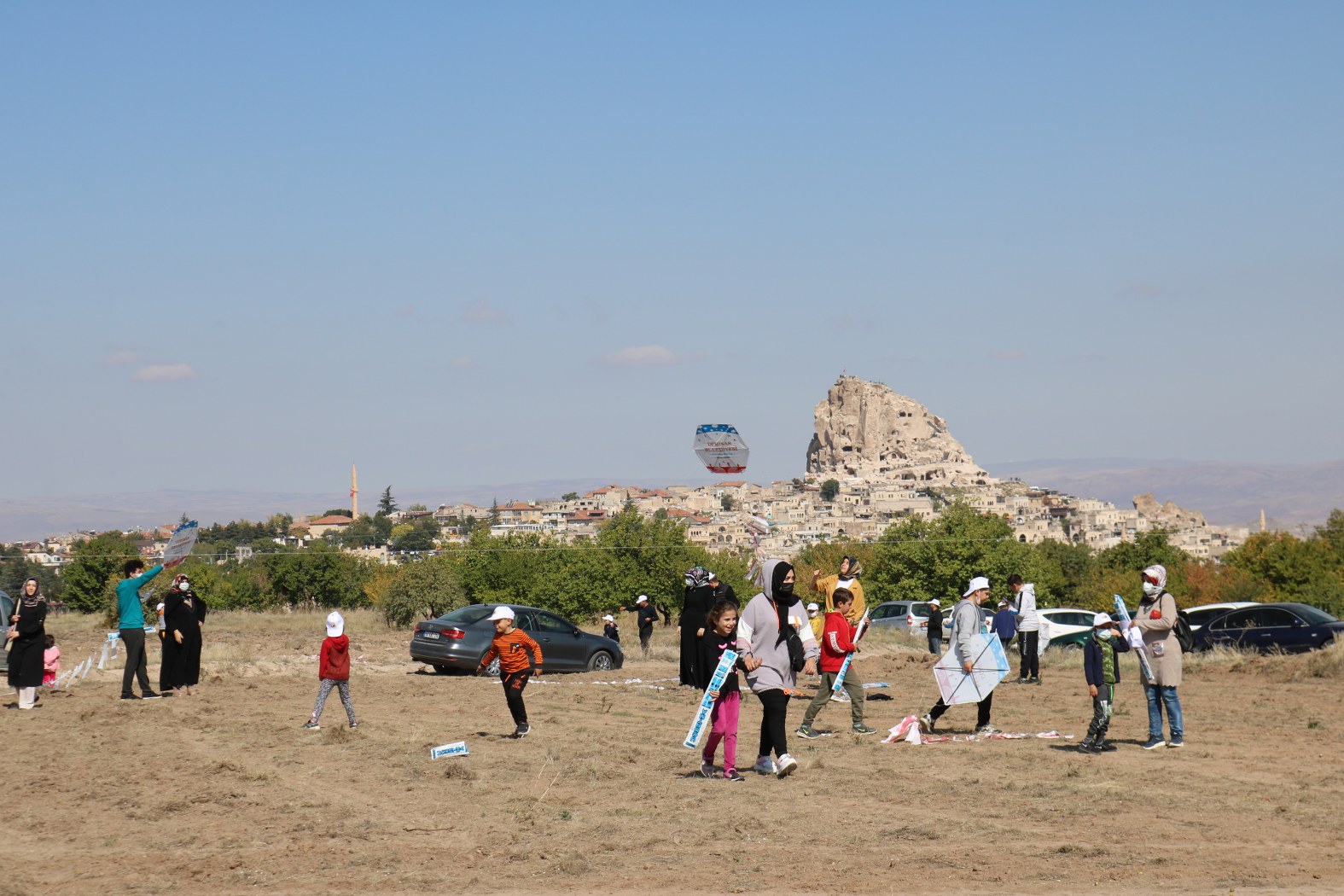 Uçhisar Belediyesi tarafından 3 Ekim Dünya Çocuk Günü nedeniyle düzenlenen uçurtma şenliğin için, 3-14 yaş grubunda yüzlerce çocuk Güvercinlik Vadisi’nin karşısındaki alanda bir araya geldi.