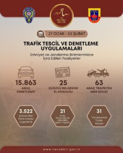Nevşehir Emniyet Müdürlüğü ve İl Jandarma Komutanlığı ekipleri 27 Ocak-02 Şubat tarihleri arasında  yaptıkları yol denetimlerinde 15 in 863 aracın denetimini yaptı.