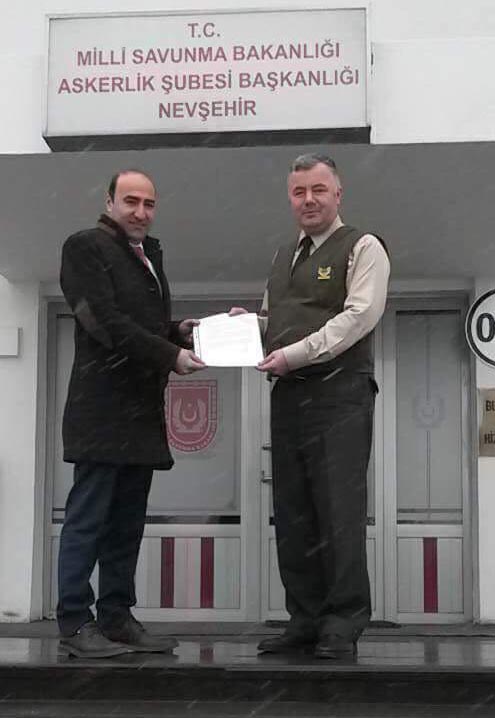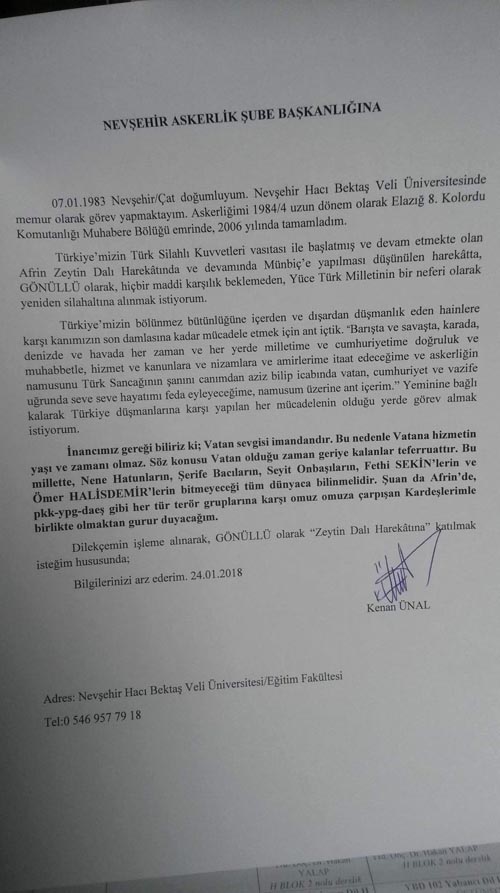 Nevşehir Hacıbektaş Veli Üniversitesinde Eğitim Fakültesin de memur olarak görev yapan 35 yaşındaki Kenan Ünal Afrin Zeytin Dalı harekatına katılmak için hiç bir maddi yardım talep etmeden gönüllü olarak askerlik şubesine dilekçe verdi