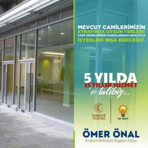 Mevcut camilerimizin etrafındaki uygun olan yerlere (imar mevzuatı da dikkate alınarak) cami giderlerinin karşılanması amacıyla kira getirisi olan işyerleri inşa edeceğiz. Ayrıca belediye bünyesinde cami temizlik ekibi kuracağız.