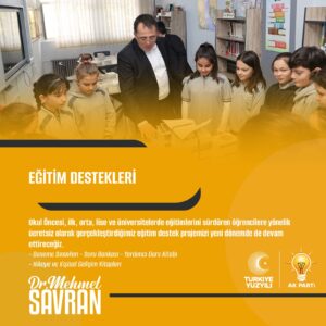 AK Parti Nevşehir Belediye Başkan Adayı Dr. Mehmet Savran, ‘Öğrenci Dostu Belediye’ anlayışıyla okul öncesi, ilk, orta, lise ve üniversitelerde eğitimlerini sürdüren öğrencilere yönelik gerçekleştirdikleri eğitim destek projelerini yeni dönemde de arttırarak sürdüreceklerinin müjdesini verdi. Geçtiğimiz yıl bu kapsamda öğrenciler için on binlerce ücretsiz soru bankası, kişisel gelişim ve okuma kitapları dağıtıklarını, deneme sınavları gerçekleştirdiklerini kaydeden Savran, “Eğitim hayatları boyunca öğrencilerimizin her türlü eğitim ihtiyaçlarını karşılamak için destek olacağız. Yaptık, yine yapacağız.” diye konuştu.