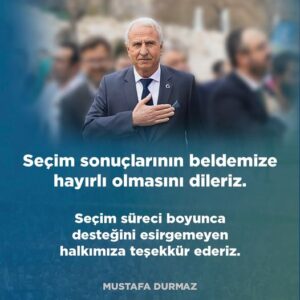 Durmaz teşekkür mesajında; “ Seçim sonuçlarının beldemize hayırlı olmasını dileriz. Seçim süreci boyunca desteğini esirgemeyen halkımıza teşekkür ederiz.