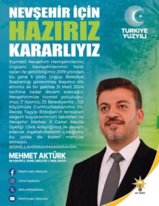 Cumhurbaşkanı Recep Tayyip Erdoğan’ın tensipleri, değerli büyüklerin takdirleri ile AK Parti Nevşehir İl Genel Meclisi 1. Sıra adayı olduğunu dile getiren Ürgüp Belediye Başkanı Mehmet Aktürk; “ Kıymetli Nevşehirli hemşehrilerim; Ürgüplü hemşehrilerimin helal oyları ile getirildiğimiz 2019 yılından bu yana 5 yıldır Ürgüp Belediye Başkanlığı görevimize başımız dik alnımız ak bir şekilde 31 Mart 2024 tarihine kadar devam edeceğiz. Nevşehirimize hizmet yolculuğumuz, ilçemiz, 23 belediyemiz ve 153 köyümüze Cumhurbaşkanımız Sn. Recep Tayyip Erdoğan’ın tensipleri, değerli büyüklerimizin takdirleri ile Nevşehir merkez İl Genel Meclis üyeliği 1. Sıra adaylığımız ile devam edecek inşallah. Rabbim, çıktığımız bu yolda da bizi mahcup etmesin.” şeklinde konuştu.