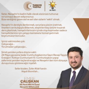28 Mayıs gecesine kadar Cumhurbaşkanımız Sayın Recep Tayyip Erdoğan’ı Türkiye Cumhuriyeti 13. Cumhurbaşkanı yapıp zaferimizi yeniden taçlandıracağız ve Nevşehir’den tüm dünyaya duruşumuzu göstereceğiz inşallah.