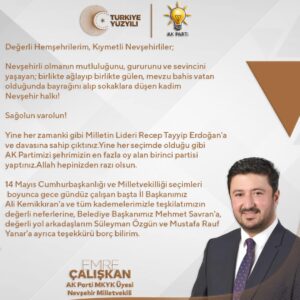 NEVŞEHİR(TRENDHABER)- 14 Mayıs 2023 Pazar günü gerçekleştirilen Milletvekilliği Genel seçiminde halkın tercihi ile AK Parti Nevşehir Milletvekili olarak seçilip TBMM’ine Nevşehir’den seçilen ikinci Milletveili olan Emre Çalışkan, Nevşehirlilere teşekkür mesajı yayımladı.