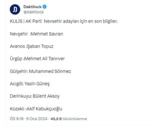 Belediye Başkan adaylarını resmi anlamda açıklanmasına günler kala, sosyal medya hesapları üzerinden AK Parti’nin belediye başkan adayları da ,çeşitli sosyal medya kullanıcılarınca da açıklanmaya başlandı.