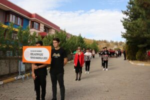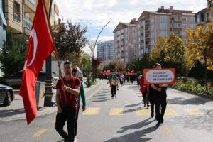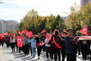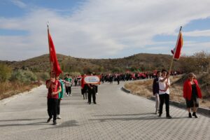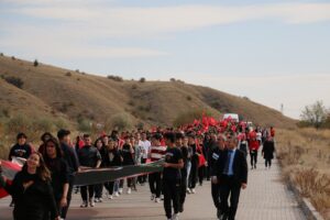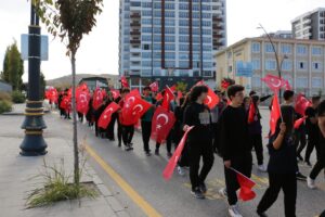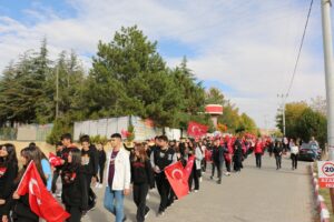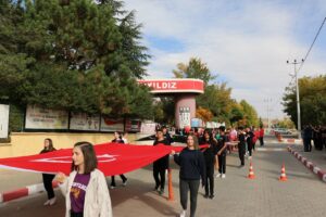 Altınyıldız Koleji kampüsü ve Kocaçay güzergâhında düzenlenen yürüyüşte öğrenciler,  büyük bir Türk Bayrağı ve Atatürk posteri taşıdılar.