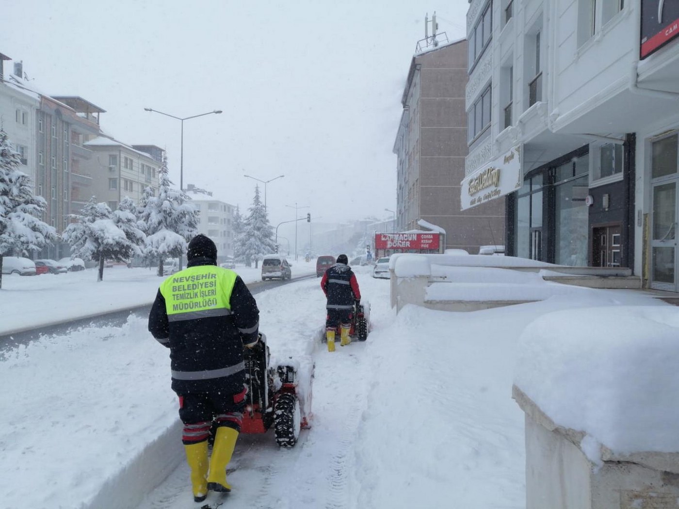 Nevşehir’de dün gece saatlerinde başlayan ve etkisini sürdüren kar yağışı ile birlikte Nevşehir Belediyesi tüm iş makineleri ve yüzlerce personeli ile karla mücadele çalışması yürütüyor.