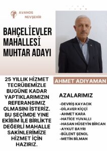 NEVŞEHİR(TRENDHABER)- Avanos ilçcesinin Bahçelievler Mahallesi Muhtar adayı Ahmet Adıyaman,5. Dönemini yürüttüğü muhtarlığın 6. Dönemi için de aday olduğunu açıkladı.