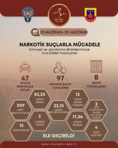 Nevşehir’in kanayan bir sosyal yarası haline de gelen uyuşturucu maddelerle mücadele çalışmaları da geçen ay içerisinde ekiplerce gerçekleştirildi. Bu çerçevede 47 olaya müdahale eden Emniyet ve Jandarma güçleri.,bu yönde haklarında arama kararı bulunan 97 kişiyi yakaladı ve bunlardan da 8 i tutuklandı.
