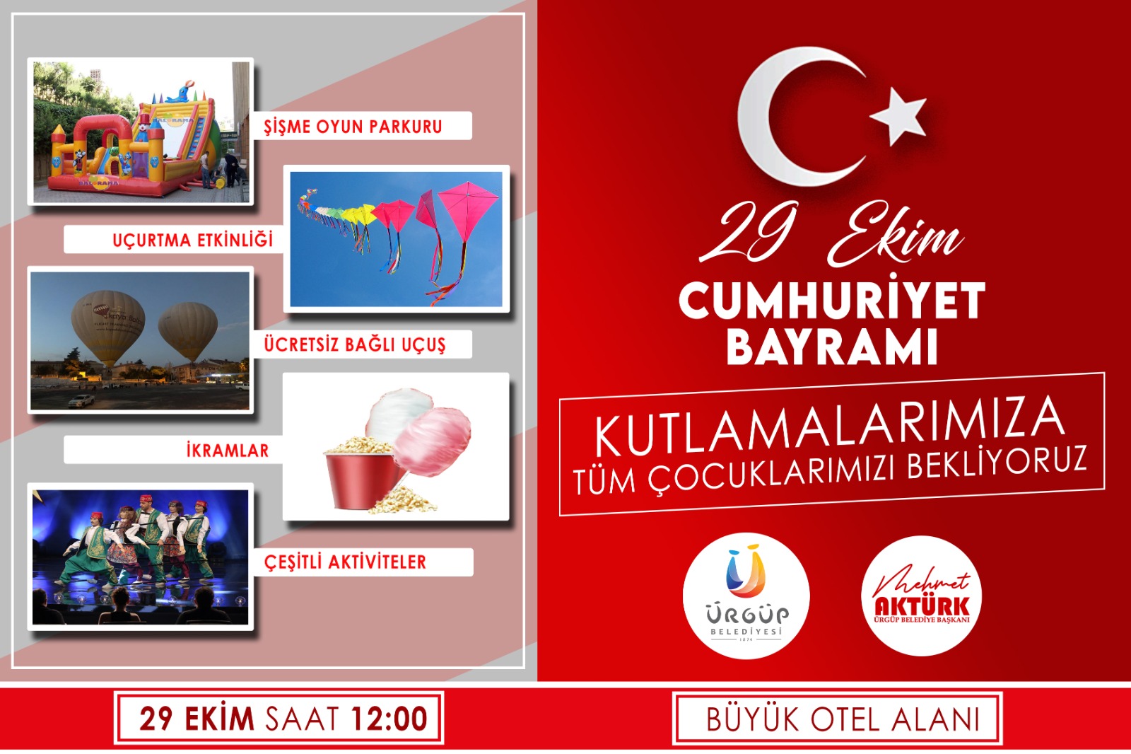 Büyük otel alanında Cumhuriyet Bayramı törenlerinin ardından saat 12:00’den itibaren akşama kadar sürecek etkinliklerde şişme oyun parkurları, animasyon ve kukla gösterileri, yarışmalar, mini sirk gösterileri ve ikramlarla çocukların gönüllerince bir bayram geçirmelerinin hedeflendiği kaydedildi.