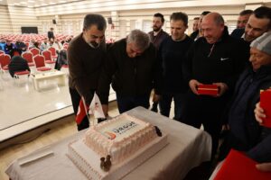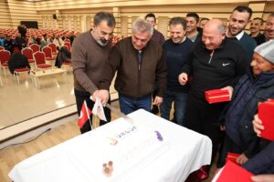 Emekli olan tüm belediye personellerine hizmetleri için teşekkür eden Başkan Bul, bir de işçilerle pasta kesti.