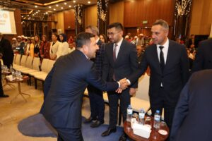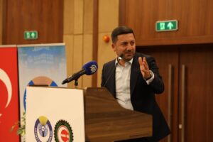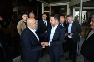 Belediye Başkanımız Rasim Arı’yla sohbet eden Hizmet-İş Sendikası Genel Başkanı Mahmut Aslan’da Olağan Genel Kurulda selamla konuşması yaparak katılımcılara teşekkür etti.