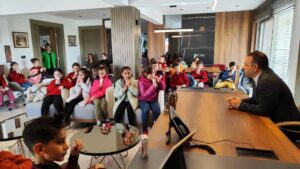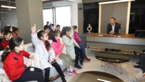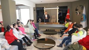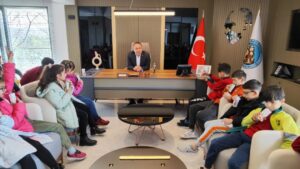 Başkan minik öğrencilerin ziyaretinden duyduğu mutluluğu dile getirdi ve belediyecilik anlamında yapılan çalışmaları öğrencilere aktardı.