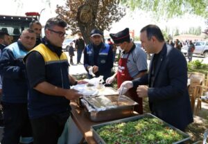 NEVŞEHİR(TRENDHABER)- Nevşehir’in Avanos ilçesinde Belediye Başkanı Celal Alper İbaş, 1 Mayıs Emek ve Dayanışma Günü münasebetiyle belediye işçileriyle bir araya geldi. Kızılırmak Nehri kıyısında işçilere yemek dağıtımı da yapan Başkan İbaş, daha sonra işçilerle halay çekip oynadı.