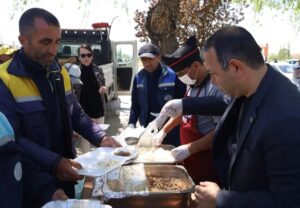 İşçilere yemek dağıtımı yapan Avanos Belediye Başkanı Celal Alper İbaş, 1 Mayıs ile ilgili günün anlam ve önemini belirtir konuşmasının ardından işçilerle birlikte yemek yedi.