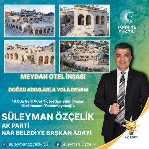 NEVŞEHİR(TRENDHABER)- Nar Belediye Başkanı ve AK Parti Nar Belediye Başkanı Süleyman Özçelik, Nar beldesinde iktisadi anlamda ciddi ivme kazandıracak Meydan Oteli inşaatı ve Dere Islahı Etrafı Yürüyüş ve Ulaşım Yolu projesini hemşehrileri ile paylaştı.