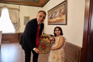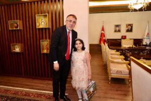 23 Nisan Ulusal Egemenlik ve Çocuk Bayramı dolayısıyla, 75. Yıl İlkokulu öğrencisi Fatma Ezgi Güçlü, ailesi ile birlikte Belediye Başkanı Dr. Mehmet Savran’ı ziyaret etti. Başkan Savran, ziyarette koltuğunu ilkokul 3. sınıf öğrencisi Güçlü’ye  devretti.