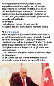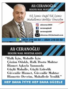 Sosyal medya hesabı üzerinden adaylığına ilişkin bilgilendirmelerde bulunan Bekdik Mahallesi Muhtar adayı Ali Ceranoğlu; “  Ben Ali Ceranoğlu ; 1969 Nevşehir doğumlu, evli ve 4 çocuk babasıyım. Uzun zamandır Bekdik Mahallemizde ikamet etmekteyim. Mahallemizin ihtiyaçlarını, sorunlarını gözlemlemekte olan bir komşunuz ve kardeşinizim. Sanayici metal ve plastik sektöründe Türkiye ‘ nin önde gelen büyük illerinde üretim yapan Hilal Geri Dönüşüm San. Ve Alfa Plastik Aş. nin kurucusuyum. Kısmet olur da beni muhtarınız olarak seçerseniz ek işimiz tek işimiz mahallemize ve sizlere hizmet etmek olacak. Sizlerin de desteği ile Bekdik Mahallemizin sorunlarını birlikte çözeceğiz. Sevgi ve saygılarımla .” ifadelerine yer verdi.