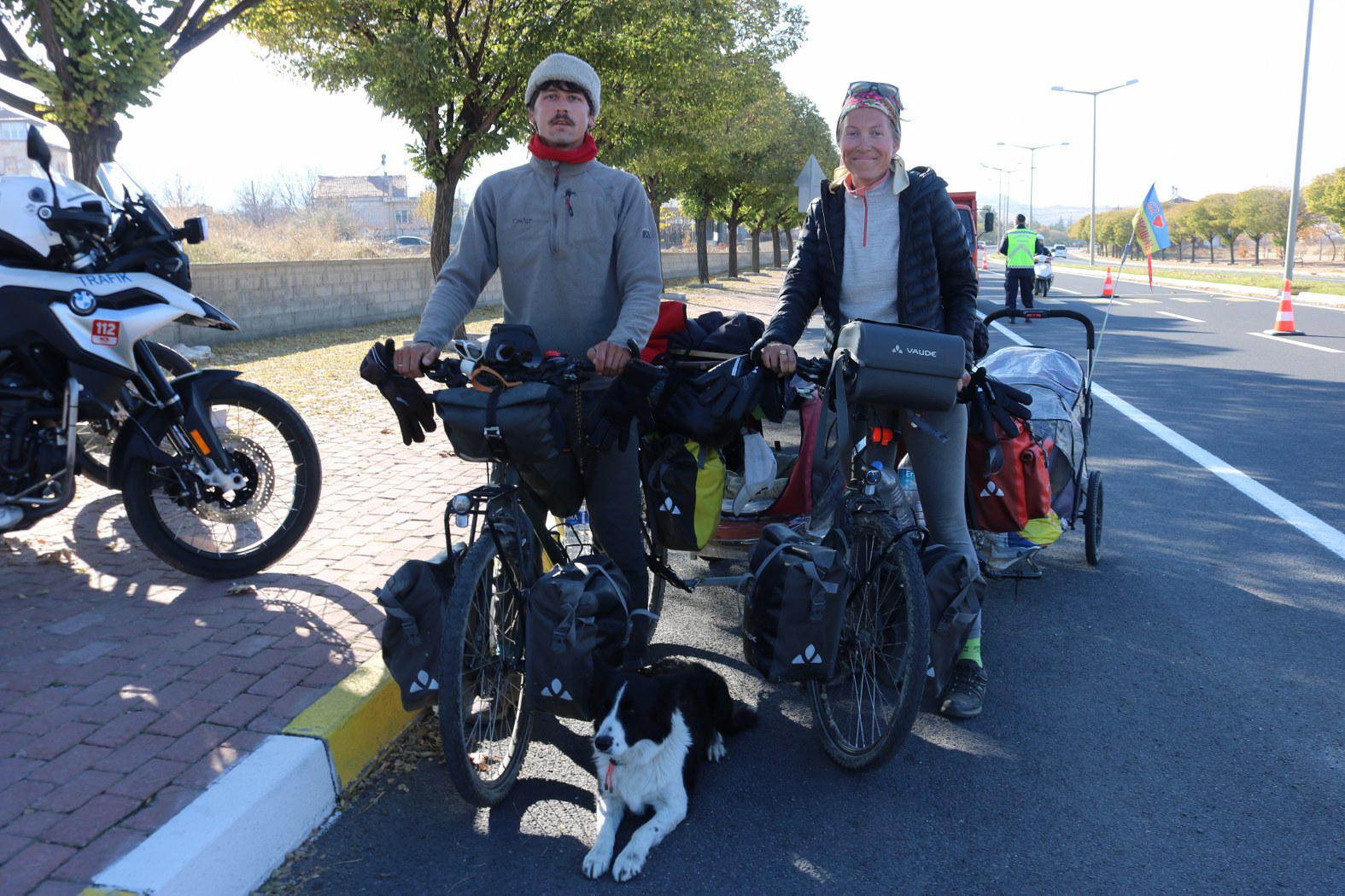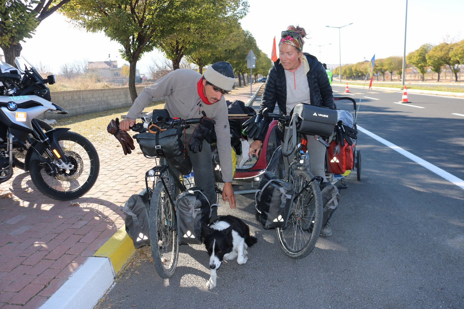 NEVŞEHİR(TRENDHABER)- Yaklaşık 7 ay önce köpekleri Ponoyo ve Moustalhe ile birlikte Fransa’nın Dunkerque şehrinden bisikletleriyle Avrupa turuna çıkan Mimar Marie ve duvar sıva ustası eşi Akim Lebbal, yolculuklarının 5500 km.sinde,  dünyanın sayılı  kültür turizm merkezlerinden biri olan Kapadokya bölgesine giriş yaptılar.