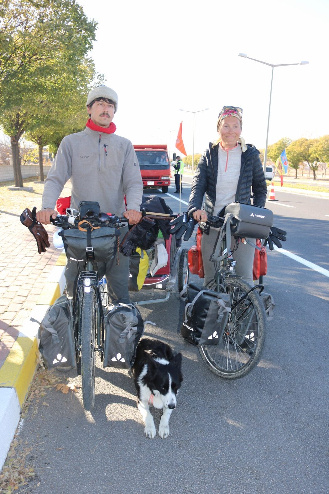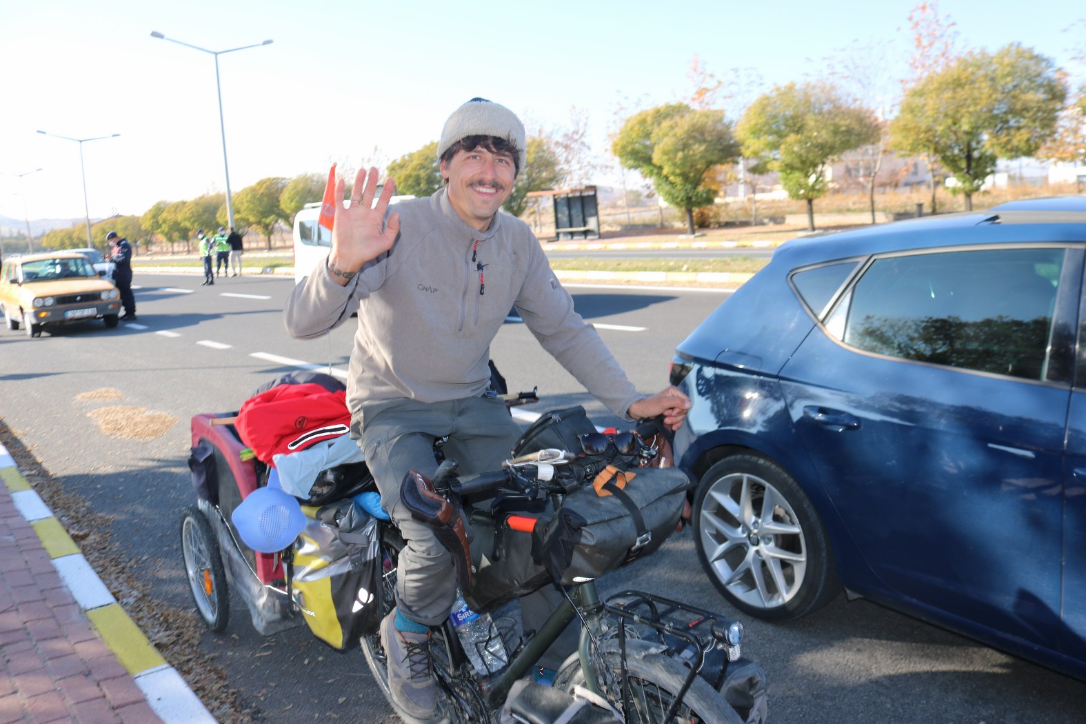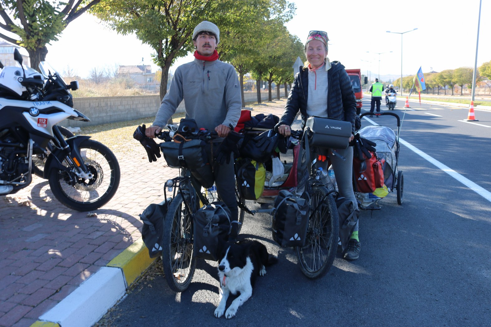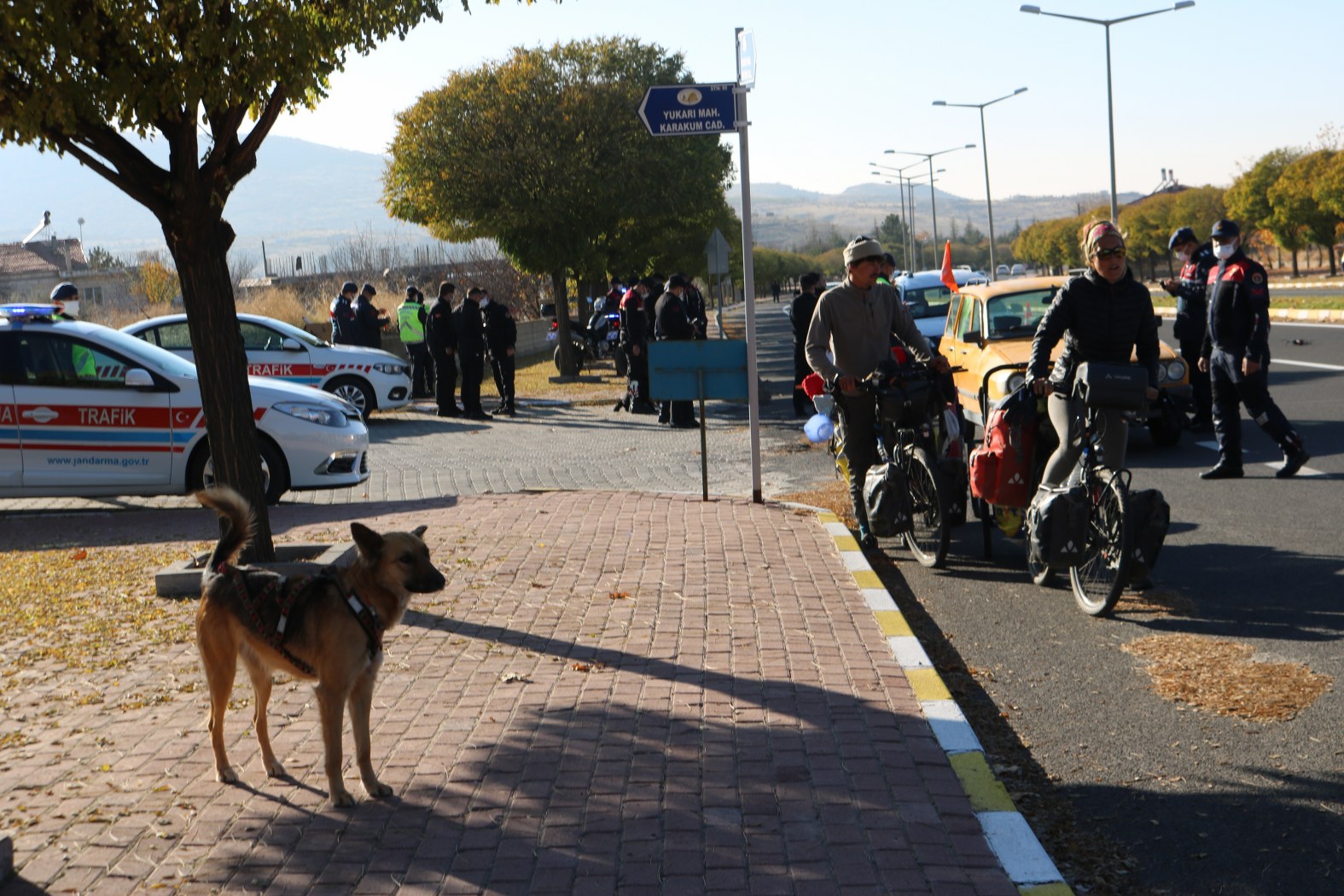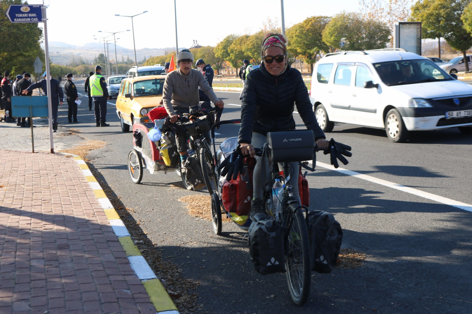 Kapadokya bölgesinde bisikletleriyle ilk olarak Uçhisar beldesine giriş yapan  Fransız mimar Marie Lebbal; “ Yaklaşık 7 ay önce eşim Akim ile birlikte bisikletlerimizle birlikte Fransa’dan başlayıp sırasıyla İsviçre,Almanya,Avusturya, Slovakya, Polonya ve Ukrayna’dan sonra Türkiye’ye geldik. Bizim için oldukça eğlenceli de geçiyor.Yanımızda çok sevdiğimiz köpeklerimiz Ponoya ve Moustalhe’de var. Onlar için bir de barınağımız var, kimi zaman bisikletimizi koşarak takip ediyorlar, kimi zamanda küçük bagajlarında dinlenerek geziyorlar. Bisikletimizle 5 bin 500. Kilometre de Kapadokya’ya geldik. Henüz bölgeyi gezmedik,Türkiye’deki tarihi yerleri de ziyaret ettikten sonra gezimizi Tacikistan’da sonlandırmayı planlıyoruz, ama imkan bulursak elbette Asya ülkelerini de gezmeyi istiyoruz.”dedi.