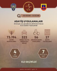 Öte yandan Jandarma ve Emniyet ekipleri son 1 hafta içinde 73 bin 194 şahsı sorguladı. Bunlar içerisinde haklarında yakalama kararı bulunan 56 şahıs yakalanırken 27 şahıs çıkarıldıkları mahkemeler tarafından tutuklandı.