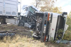 Çarpmanın etkisi ile kamyon yol kenarına devrilirken, kamyondaki buğdaylar yola saçıldı.