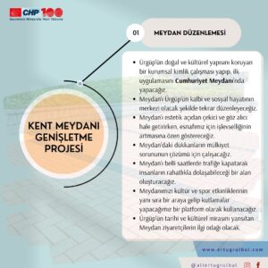 - Bütünlüklü olarak hayata geçireceğimiz 4 büyük projeyle Ürgüp’ün KENT MERKEZİ’ni geliştireceğiz. Böylece Ürgüplülerin ve ziyaretçilerin gezip, zaman geçirecek daha fazla mekanı, ziyaretçilerin Ürgüp’e gelmek için daha fazla nedenleri olacak.