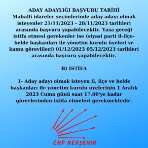 Mahalli idareler seçimlerinde aday adayı olmak isteyenler 21/11/2023 – 28/11/2023 tarihleri arasında başvuru yapabilecektir. Yasa gereği istifa etmesi gerekenler ise (siyasi parti il-ilçe-belde başkanları ile yönetim kurulu üyeleri ve kamu görevlileri) 01/12/2023 05/12/2023 tarihleri arasında başvuru yapabilecektir.  B) İSTİFA  1- Aday adayı olmak isteyen il, ilçe ve belde başkanları ile yönetim kurulu üyelerinin 1 Aralık 2023 Cuma günü saat 17.00’ye kadar görevlerinden istifa etmeleri gerekmektedir.”