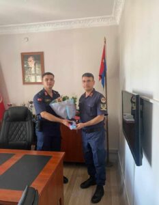 Görev devir teslim töreninde J. Asb.Kd. Bçvş. Hanifi Ok yeni İlçe Jandarma Komutanı Hamza Çimen’e çiçek takdim ederek görevinde başarılar diledi.