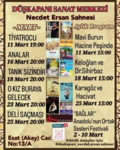 Buna göre, Düşkapanı Sanat Merkezi Necdet Ersan sahnesinde 11 Mart’ da “Tiyatrocu”, 16 Mart’ da “Analar”, 18 Mart’ da “Tanık Sizindir”,  23 Mart ’da “ O Kız Buraya Gelecek”  ve 25 Mart ’da “Deli Saçması”  isimli tiyatro oyunlarının yanı sıra 11 Mart’ da “Mavi Burun Hazine Peşinde” ,  18 Mart’da “Keloğlan ve Dr. Sihirbaz” ve 25 Mart ’da da “Karagöz ve Hacivat” isimli çocuk oyunlarına da ev sahipliği yapacak.