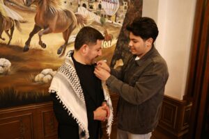 Nevşehir Hacı Bektaş Veli Üniversitesi TÖMER Türkçe Öğretim Merkezi hazırlık sınıfı öğrencileri Rahaf Abu Hassira ve Farhan Abu Hassira, Nevşehir Hacı Bektaş Veli Üniversitesi’nde görevli öğretim üyesi Doç. Dr. Özden Taşğın mihmandarlığında Belediye Başkanı Rasim Arı’yı ziyaret ederek bir süre sohbet etti. Türkiye Belediyeler Birliği (TBB) Encümen Üyesi ve Avrupa Konseyi Yerel ve Bölgesel Yönetimler Kongresi (YBYK) Yerel Meclis Asil Üyesi olan Belediye Başkanı Rasim Arı, farkındalık oluşturmaya ve Dünya gündemini ilgilendiren konularla ilgili otorite olmaya devam ederken Nevşehir’de yaşayan 2 Filistinli öğrenci Başkan Arı’nın Fransa’da yaptığı konuşmanın duygularına tercüman olduğunu ve milyonlarca Filistinli’nin sesi olduklarını ifade ederek Başkan Arı’ya Filistin bayraklı rozet ve keffiyeh Filistin atkısı armağan etti.