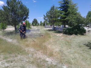 NEVŞEHİR(TRENDHABER9- Nevşehir’in Hacıbektaş ilçesinde belediye ekipleri, Kurban bayramı öncesinde mezarlıklarda ot biçme ve temizlik çalışmaları yaptı.
