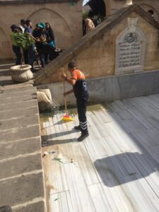 Ekip öncelikli olarak Hacıbektaş Veli Türbesinin iç mekanlarıyla dış mekanlarını tazyikli su ile dip bucak yıkadı.