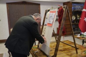 Nevşehir Belediyesi tarafından yürütülen proje çerçevesinde 29 Ekim Cumhuriyet Bayramı’na kadar tamamlanması planlanan Türk Bayrağı’na 1001 adet ilmek atılacak. Nevşehir Valisi Ali Fidan, Nevşehir Belediyesi Gençlik ve Spor Hizmetleri Müdürü Hasan Hüseyin İyilikli ile Halı Atölyesi Hocası Fatma Turgut’u makamında kabul etti.
