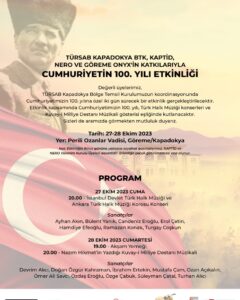 NEVŞEHİR(TRENDHABER)- TÜRSAB Kapadokya BTK, KAPTİD,NERO VE GÖREME ONYX’in katkılarıyla Türkiye Cumhuriyeti’nin 100. Yılı etkinliği ,Nevşehir’in Göreme beldesindeki Göreme Perili Ozanlar Vadisi’nde 27-28 Ekim tarihleri arasında gerçekleştirilecek.