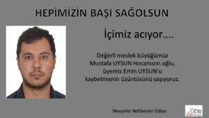 Nevşehir Rehberler Odası Başkanı Özay Onur, meslek büyükleri Mustafa Uysun’un evladı ve aynı zamanda Oda üyesi Emin Uysun’u kaybetmenin acısı içerisinde olduklarını belirttiği bir de taziye mesajı yayımladı.
