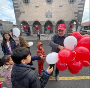 Belediye ekipleri törene katılanlara üzerinde Türk Bayrağı ile Atatürk motifli kırmızı beyazlı balonlar dağıttılar.