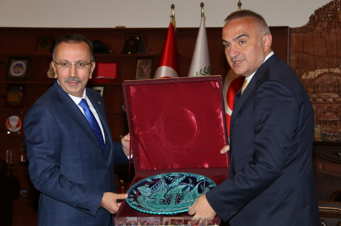 Nevşehir Belediye Başkanı Atilla Seçen, ziyaretin anısına Kültür ve Turizm Bakanı Mehmet Nuri Ersoy’a çini tabak hediye etti